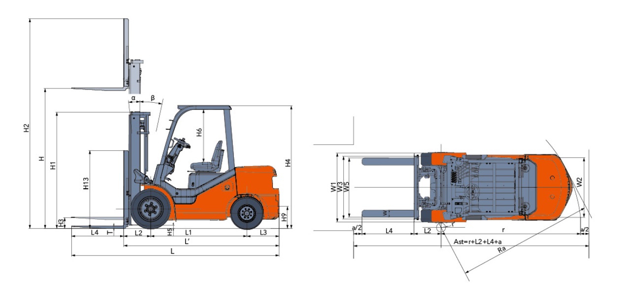 Данная характеристика служит условием безопасной эксплуатации техники на площадках с различной конфигурацией. Чем меньше габаритные размеры и радиус разворота, тем меньше требуется ширина прохода для маневрирования загруженного погрузчика. В спецификациях указано, что радиус поворота техники и габариты транспортируемого груза не должны превышать минимальную ширину проездов внутри помещений складов.
