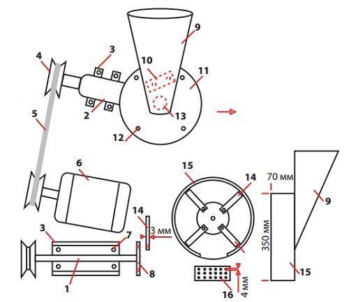 Для шнекового потрібно більш потужний двигун, наприклад 3 квт, тому що він поступається в продуктивності. Для скребкового можна взяти двигун 1,5 або 2,5 квт. Ключовою деталлю скребкового зерномета є довга елеваторна ланцюг від комбайна зі шкребками, яка поміщається в жолоб.