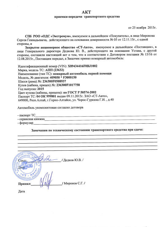 Акт приема передачи к договору аренды транспортного средства без экипажа