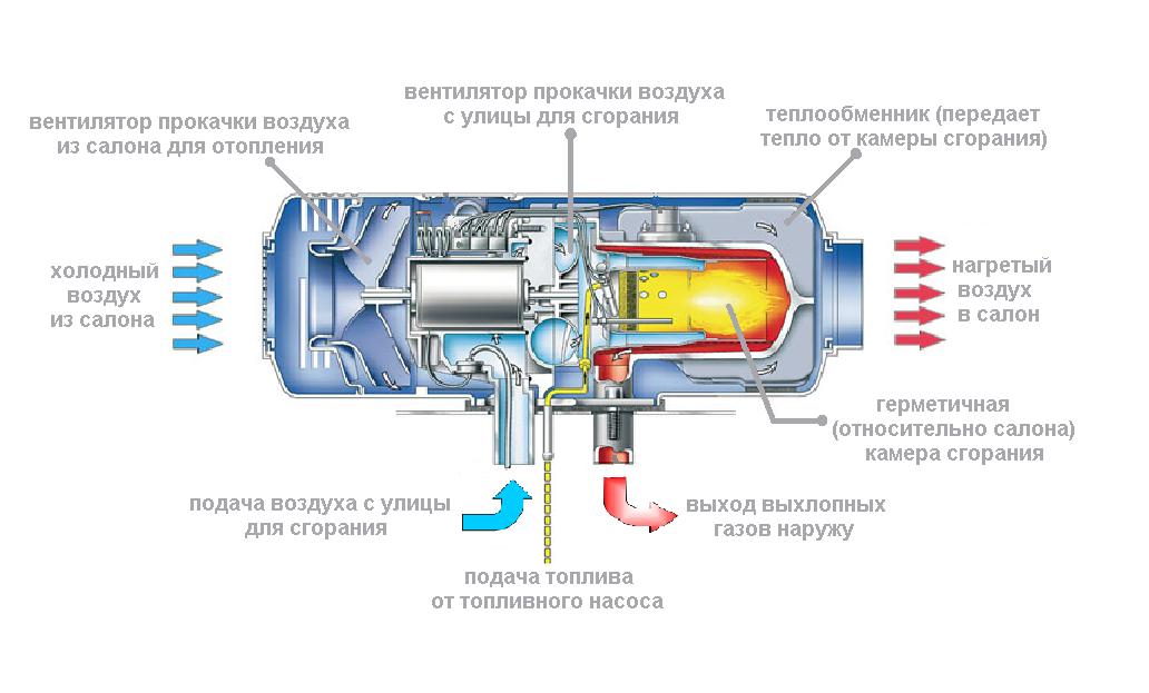 При сгорании топлива в камере подогревателя выделяется тепло, которое передается теплообменнику. Проходящая сквозь него жидкость нагревается и, с помощью встроенного насоса, циркулирует в системе водяного охлаждения двигателя.