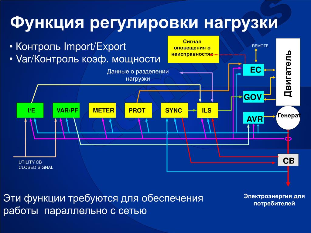 Что нужно. При запуске двигателей могут возникать большие провалы напряжения и частоты, если генераторная установка не рассчитана должным образом. Другие нагрузки, подключенные к выходу генератора, могут быть более чувствительны к скачкам напряжения и частоты, чем двигатель или пускатель двигателя, и это может вызвать проблемы. Например, скорость изменения частоты генератора более 1 Гц/с может привести к неисправности некоторых статических ИБП.