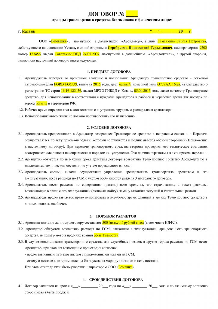 Договор аренды автомобиля между физическим и юридическим лицом (docx) или (в формате pdf)