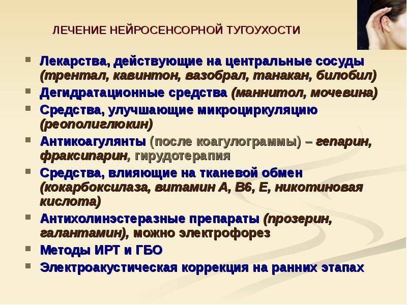 Также используются медикаменты, улучшающие кровоснабжение головного мозга и обмен веществ в клетках звукового анализатора. В случае острого возникновения заболевания пациент направляется в стационар отоларингологического отделения.