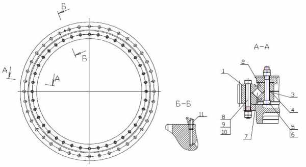 1-зубчатый венец; 2,3-полуобоймы; 4-прпокладка; 5,8-болты; 6,9-гайки; 7-ролик; 10-шайба; 11-масленка
