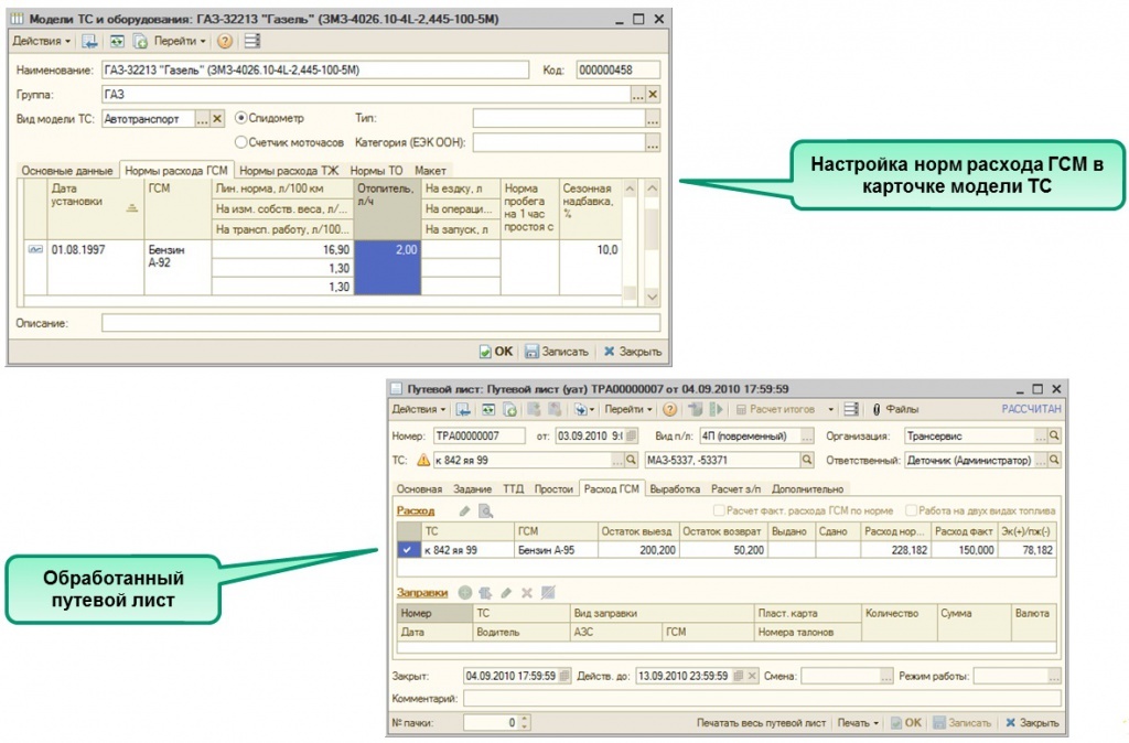 В программе можно рассчитывать расход топлива в зависимости от времени года, типа трассы и других параметров, указанных пользователем. Для этого в соответствующих справочниках вводятся нормы и коэффициенты расхода. При расчёте с поставщиком горюче-смазочных материалов возможны два варианта оплаты: наличные денежные средства и безналичный расчёт (перевод денежных средств со счёта, талоны, топливные карты). Для каждого из этих вариантов предусмотрен отдельный документ.