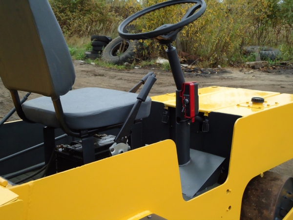 Компоновочная схема дорожного катка данной модели очень проста – массивный корпус, задний приводной вибрационный каток, двигатель в задней части, механическая трансмиссия и передний поворотный каток. Рулевой механизм червячного типа с передаточным числом червячного редуктора равным 30 обеспечивает надлежащую маневренность. Но, по отзывам пользователей, каток обладает некоторой инертностью при поворотах, поэтому начинать маневр необходимо заранее.