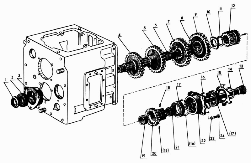 Вал блока шестерен 33 (см. рис. 4) установлен в корпусе (1) на подшипниках (27) и (35). Шестерни (32) (34) соединяются с валом с помощью шлицев и стопорятся стопорным кольцом.