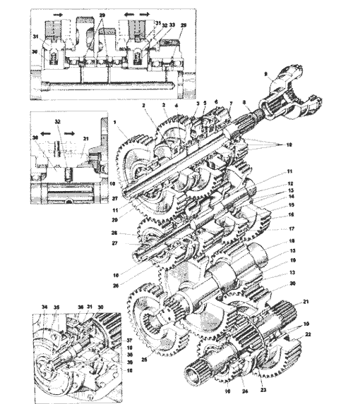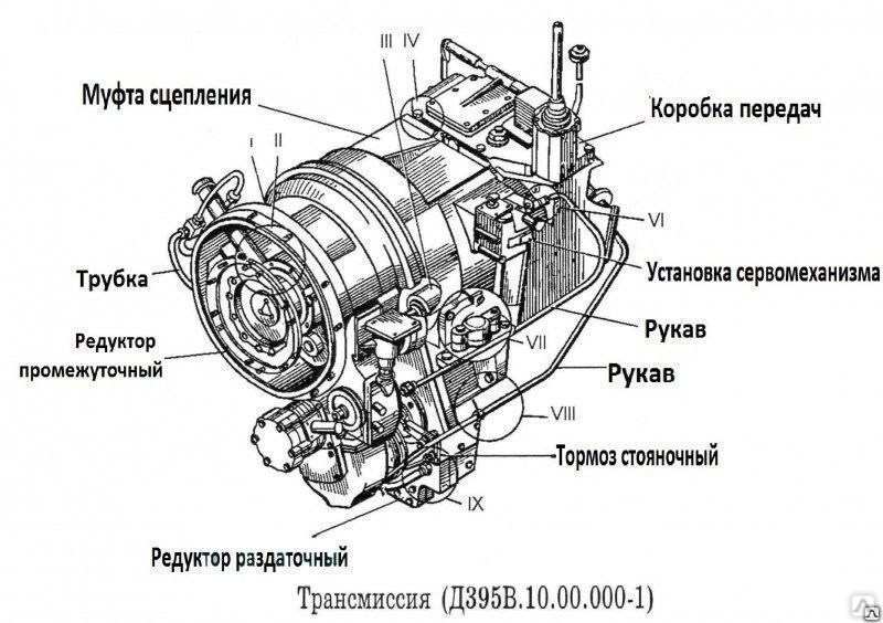 Коробка передач, редуктор привода гидронасосов и обычный раздаточный редуктор соединены в единый блок. Все модели унифицированы и прекрасно работаю. Отличаются надежной коробкой передач, мощным двигателем. Используется в модели механическая КПП, имеется также и мультипликатор. Подобное сочетание позволяет использовать шесть передач.