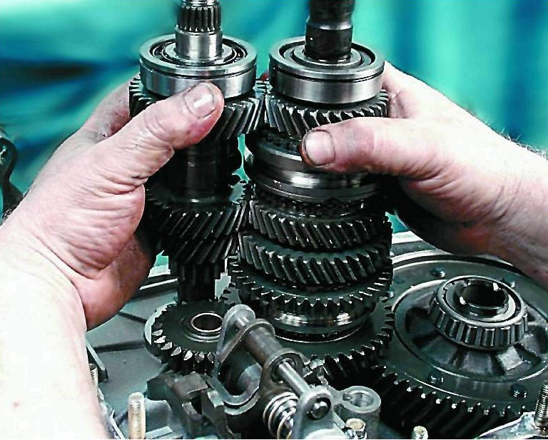 Выполняется ремонт на специальном поворотном стенде. Если необходимо заменить детали коробки, ее придется полностью разобрать и внимательно осмотреть на предмет наличия трещин и срывов резьбы. Если на шестеренках сломаны зубья, их (то есть шестерни), нужно поменять.