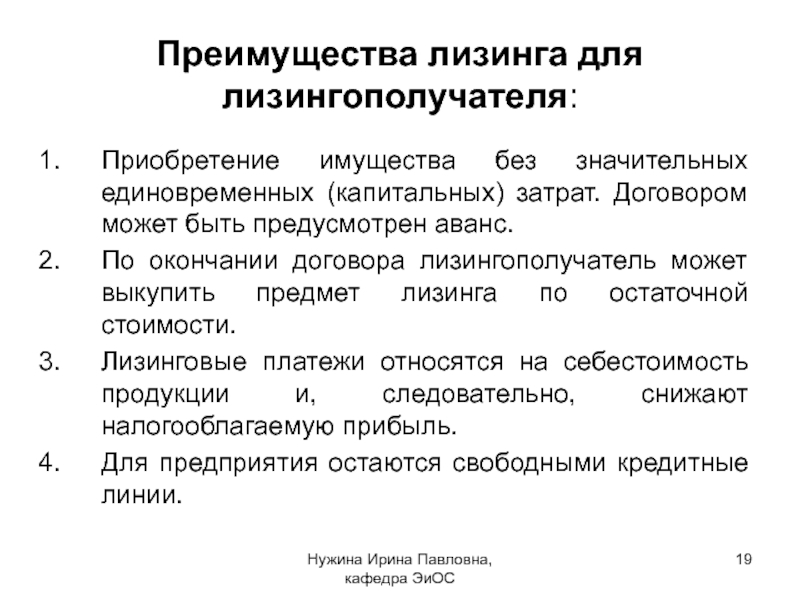 - Лизинг позволяет предприятию при минимальных единовременных затратах приобрести современное оборудование без значительного единоразового вложения собственных средств.