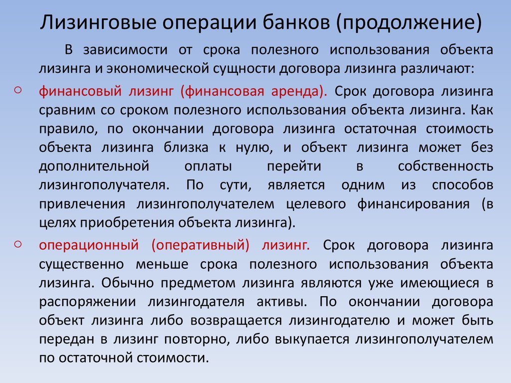 По окончании договора лизинга имущество переходит в собственность клиента. Договоры финансового лизинга заключаются на срок, сопоставимый со сроком полной амортизации объекта лизинга.