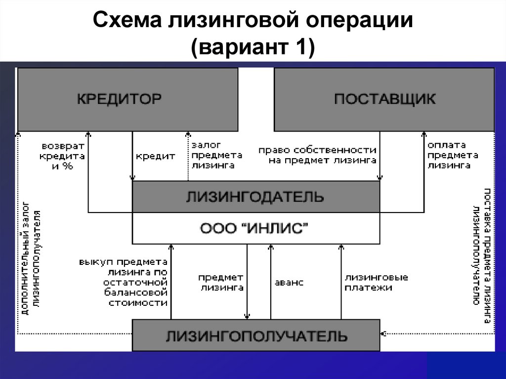 Поставщика и предмета лизинга в подавляющем большинстве случаев выбирает лизингополучатель. В процессе действия договора лизингополучатель производит платежи по выкупу имущества, а также оплачивает проценты за пользование заёмными средствами и возмещает лизинговой компании дополнительные расходы по имуществу (налоги, страхование и т.п.) в случае их наличия. По окончании договора лизинга предмет лизинга переходит в собственность лизингополучателя по минимальной остаточной стоимости. Лизинг обладает рядом налоговых и организационных преимуществ.