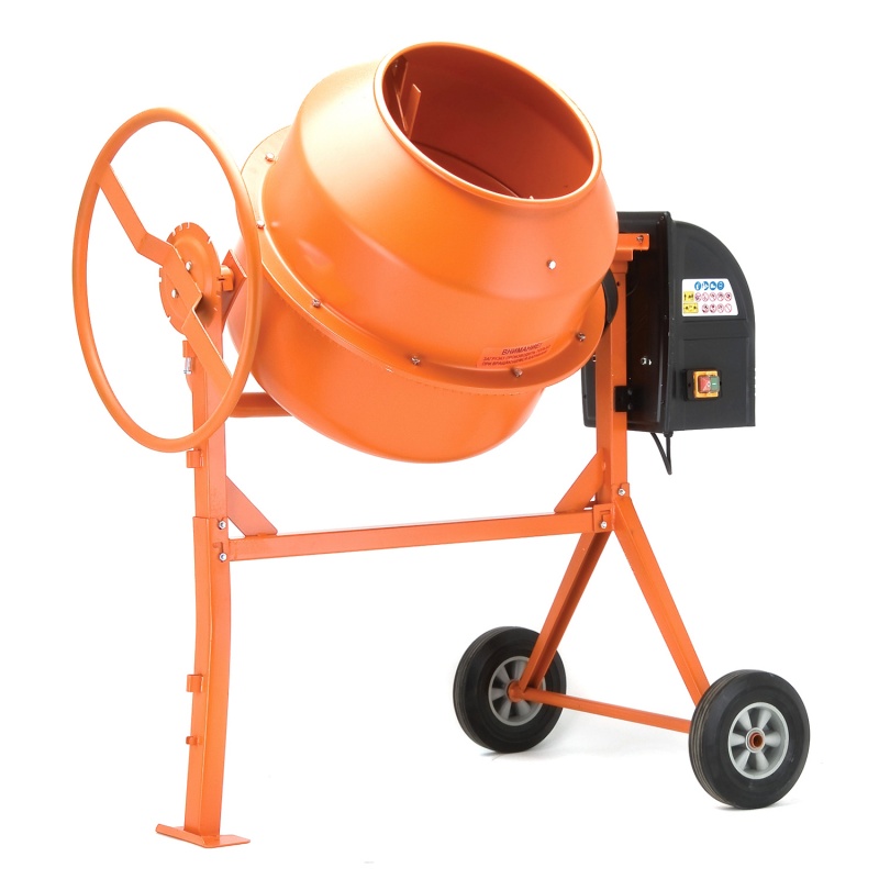 Актуальна при отделке помещений (укладка плитки, штукатурка и т. д.). Особенности: — Модель со стальным венцом. Стальные перфорированные венцы работают сравнительно тихо, но главное их достоинство заключается в их относительной долговечности. — Хорошие параметры для мелких по масштабу строительных работ: объем барабана 63 литра, мощность 220 Вт, вместимость барабана по загрузке 45 литров. — Малый вес. Преимущества: — Штурвальное устройство, которое является наиболее удобным вариантом для выгрузки бетона, позволяет легко опрокинуть рабочую емкость и тем самым опорожнить ее. — Колеса позволяют легко перемещать оборудование по строительной площадке. — Прочная рабочая емкость из стали не менее 2 мм рассчитана на долгий срок службы. — Яркий цвет бетономешалки соответствует правилам СНИПа, которые предписывают окрашивание потенциально опасной техники в яркие цвета. — Обслуживаемый опорный подшипник барабана при необходимости можно заменить, что увеличивает срок службы бетономешалки. — Мощный электромотор от сети 220В оптимально подходит к емкости каждой модели и дает возможность использовать устройство максимально эффективно.