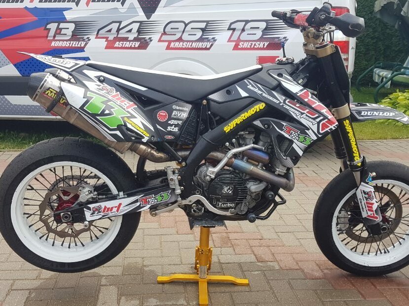 RX 450 – последняя разработка, использующая все достоинства традиционных кроссовых мотоциклов. 4-тактный двигатель жидкостного охлаждения мощностью 54 л.с. с учетом низкой массы мотоцикла (всего 110 кг) обеспечивает отличные динамические характеристики. В модели применены пространственная рама из высококачественной легированной стали, легкий и надежный маятник, 6-ступенчатая коробка передач. В RX 450 использованы комплектующие от ведущих мировых производителей: глушитель Leo Vince, пластик Acerbis, карбюратор Dell’Orto, органы управления Domino, цепь D.I.D., профессиональная подвеска Fast Ace. Переднее колесо имеет размерность 21 дюйм, заднее – 19 дюймов, алюминиевые диски с металлическими спицами. Особые решения