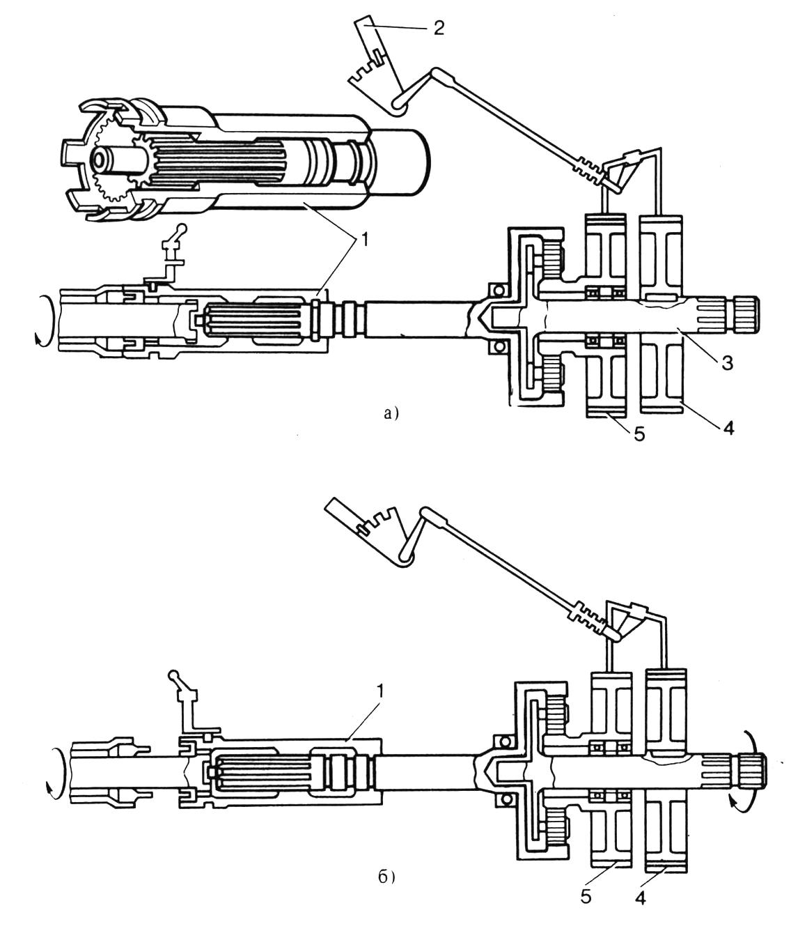 При перемещении рукоятки вперед включается синхронный привод, а назад — независимый привод.