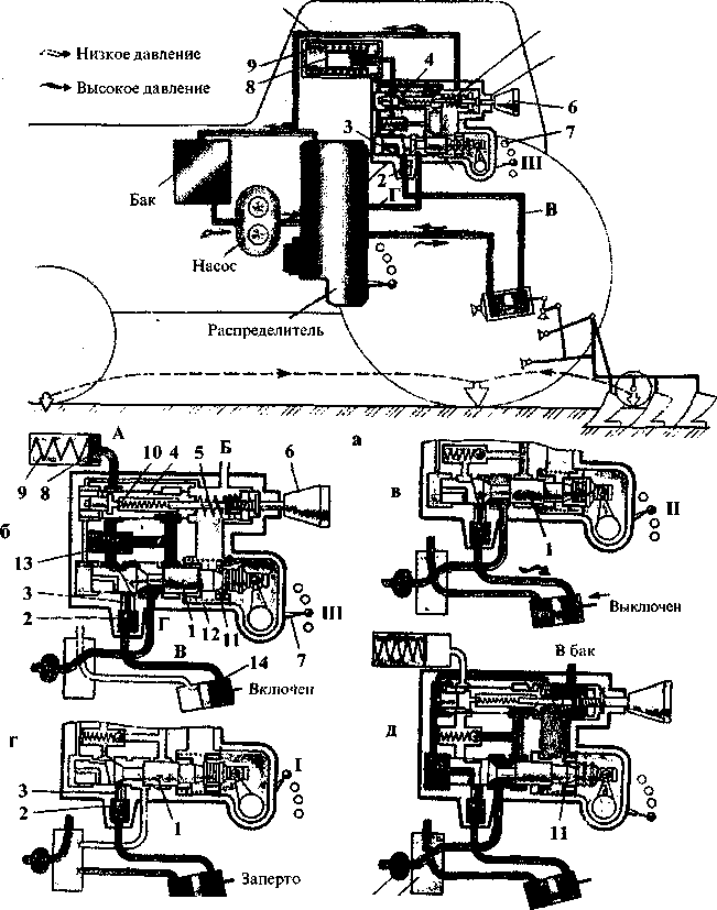 - «Плавающее» — крайнее нижнее положение рычага. Перепускной клапан открыт и сбрасывает поступающую от насоса рабочую жидкость в слив.В таком положении рабочая жидкость свободно перетекает в обе стороны из обеих полостей гидроцилиндра. Гидроцилиндр находится в свободном положении и реагирует на действие внешних условий и собственной тяжести машины. Таким образом, это позволяет рабочим органам агригатируемой машины копировать рельеф при обработке почвы и держать стабильность глубины обработки.