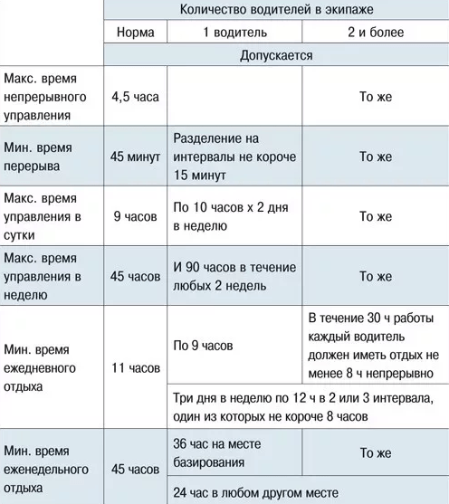 - максимум протяжённости рабочей смены устанавливается в 9 часов, в неделю водитель не должен проводить за рулём транспортного средства более 45 часов;