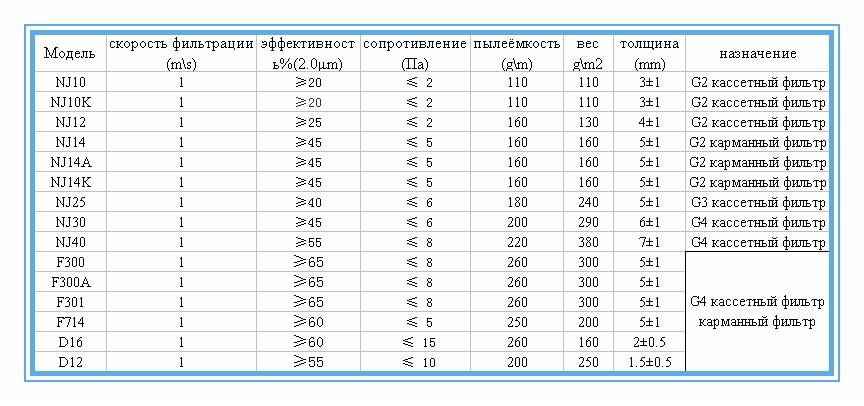 | Наименование показателей | Плотность (г/м2) | Толщина | Воздухопроницаемость (дм3/м2*с) | Начальное сопротивление (фильтр 592*592*96) | Ширина, длина в рулоне (мм/м) |