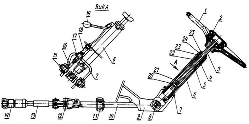 Схема рулевого управления трактора МТЗ 82: 1 — рулевое колесо; 2 — маховичок; 3 — рулевой вал; 4 — винт; 5 — промежуточный вал; 6 — труба рулевой колонки; 7 — серьга; 8 и 12 — карданные шарниры; 9 — стойка; 10 — средний вал; 11 — промежуточная опора; 13 — передний вал; 14 — шлицевая втулка; 15 — винт; 16 — правая стенка стойки; 17 — фиксатор; 18 — пружина; 19 — рукоятка; 20 — штифт; 21 и 24 — гайка; 22 — втулка; 23 — амортизатор; 25 — контргайка.