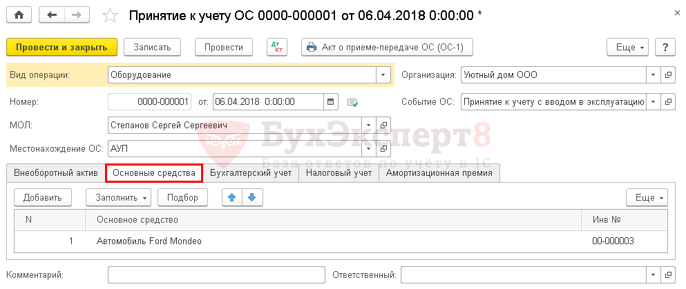 к учету передаваемых в лизинг основных средств (документ “Принятие к учету ОС”)