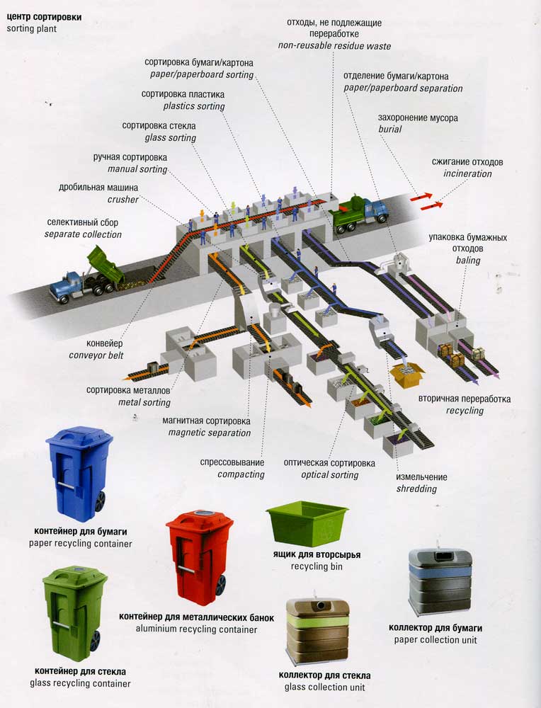 - После отходы необходимо разделить по фракциям. Для этого на сортировочных комплексах используется ручной труд, в сочетании с различным специализированным оборудованием.