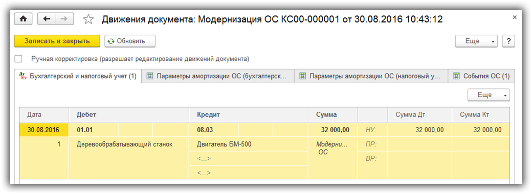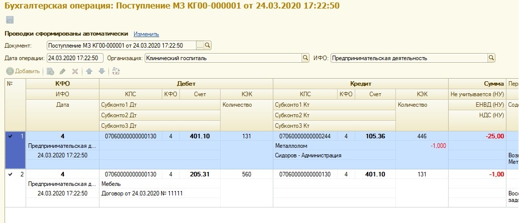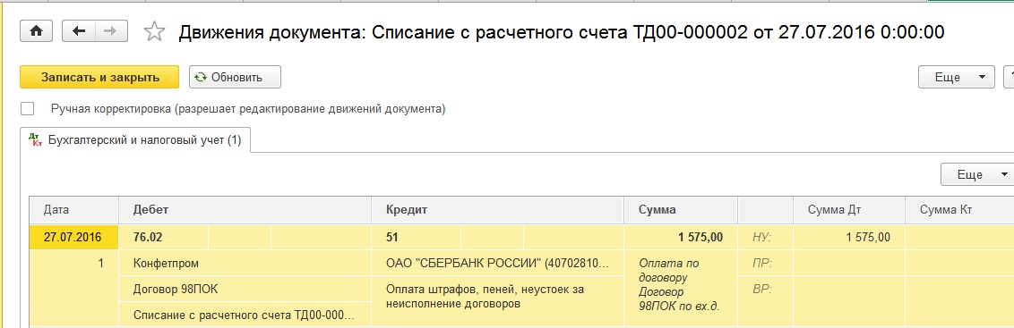 При проведении документа формируются следующие проводки по списанию товара и приходу денежных средств.