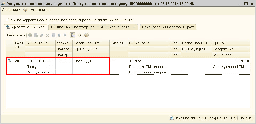 Указываем организацию, поставщика, договор и склад (вид склада должен быть “оптовый”). В таблицу добавляем строки с товаром, счет учета – 41.01. Если поступление с НДС, выбираем счет 19.03, указываем дату, номер и регистрируем счет-фактуру поставщика, нажав на соответствующую кнопку в нижней части формы.