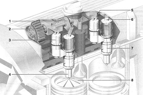 Впрыск топлива контролирует клапан управления, расположенный внутри форсунки, основным элементом которого является игла. Насос-форсунки расположены под клапанной крышкой на головке блока. Такое расположение конструктивно обосновано установкой кулачка, преобразовывающего крутящийся момент распределительного вала в поступательное движение плунжера поршня насоса высокого давления.
