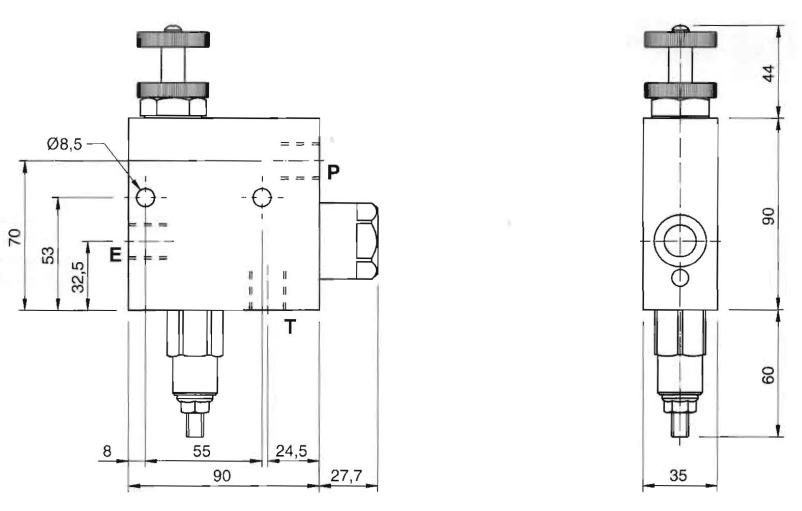 При установке регулятора потока “на входе” или “на выходе” насос работает с постоянным давлением, на которое отрегулирован предохранительный клапан. Избыток рабочей жидкости, нагнетаемый насосом, сливается в бак через предохранительный клапан. Это вызывает дополнительные затраты мощности и требует установки