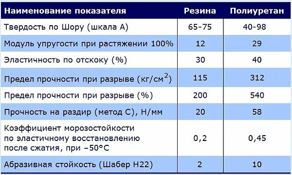 Чтобы понять, чем отличается резина от полиуретана, рассмотрим их основные физико-механические и эксплуатационные характеристики. Для удобства сравнения сведем все данные в таблицу: