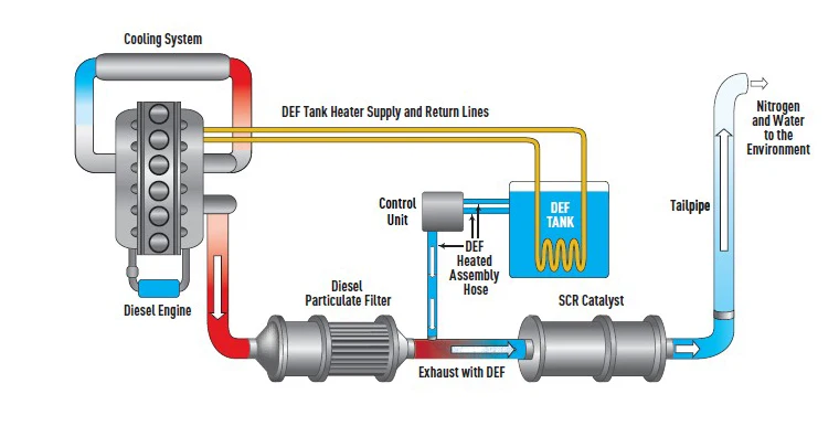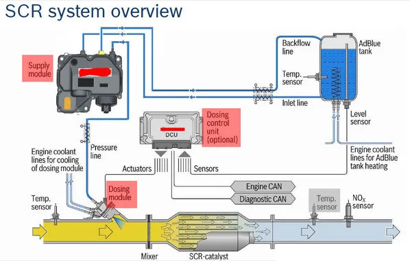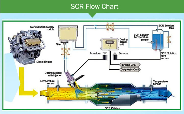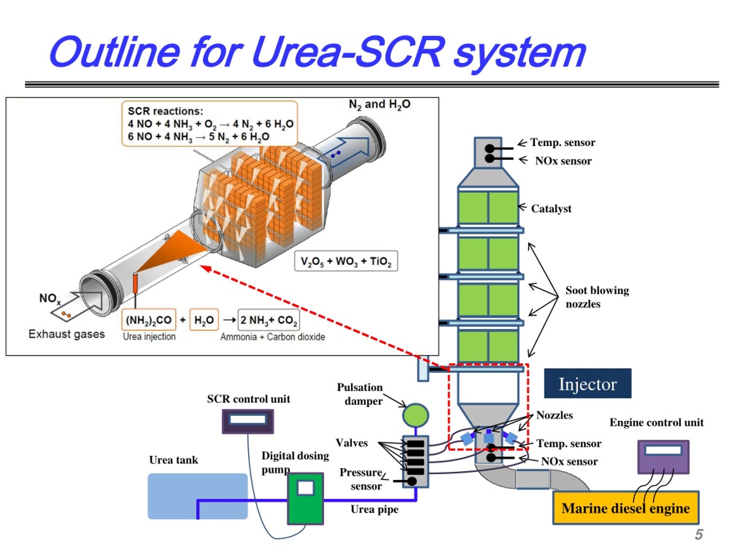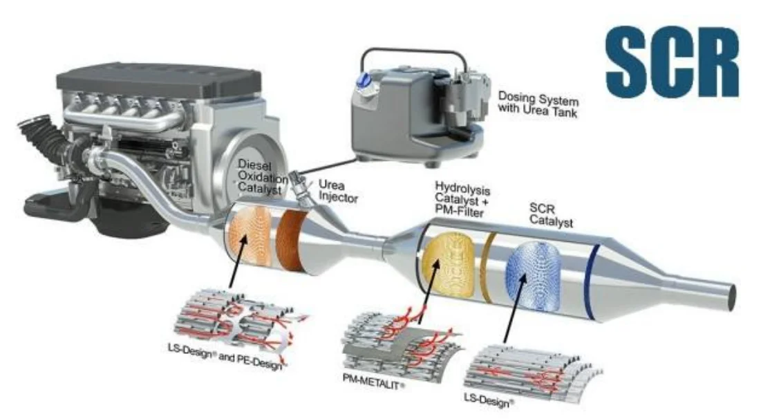 Системы SCR мочевины обычно включают катализатор SCR, вспомогательный катализатор окисления и систему впрыска мочевины, которая подает водный раствор мочевины перед катализатором SCR. Высокие показатели сокращения выбросов NOx зависят от температурного диапазона катализатора и сложной стратегии управления впрыском мочевины с электронным управлением.