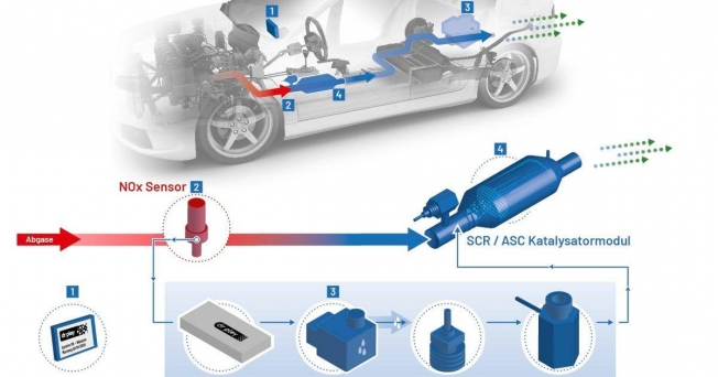Он заливается в специальный бак, объем которого почти всегда пропорционален объему топливного бака. Расход мочевины равен приблизительно 4-8 % от расхода топлива. Из бака раствор через насосный модуль закачивается в устройство дозирования. Оттуда под давлением в 5 бар он впрыскивается в разогретый до 200 градусов Цельсия каталитический нейтрализатор. После этого происходит гидролиз с образованием аммиака. Далее –реакция восстановления, при которой образуются исходные формы: азот и вода.