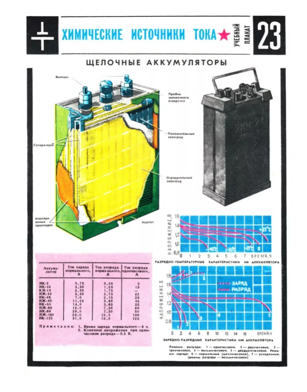 Пластины и электролит щелочных аккумуляторов помещ т в закрытый сосуд из стали. Преимущество этих аккумуляторов перед кислотными в простоте обслуживания и высокой механической прочности. Кроме того, они не требуют постоянного контроля за концентрацией электролита. Рабочее напряжение заряженных аккумуляторов 1,30 – 1,34 В (для никель-кадмиевых) и 1,37 – 1,41 В (для железо-никелевых). [c.58]Щелочные аккумуляторы применяются в лабораторной практике для тех же целей, что и свинцовые, но благодаря незначительному весу и нечувствительности к сильным колебаниям отбираемого от них тока они имеют в ряде случаев значительные преимущества перед свинцовыми аккумуляторами. [c.8]