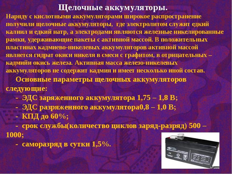 Основные массовые типы щелочных аккумуляторов — железо-никелевые и кадмий-никелевые. Их преимущества перед свинцовыми заключаются в более длительном сроке службы и большой механической прочности.