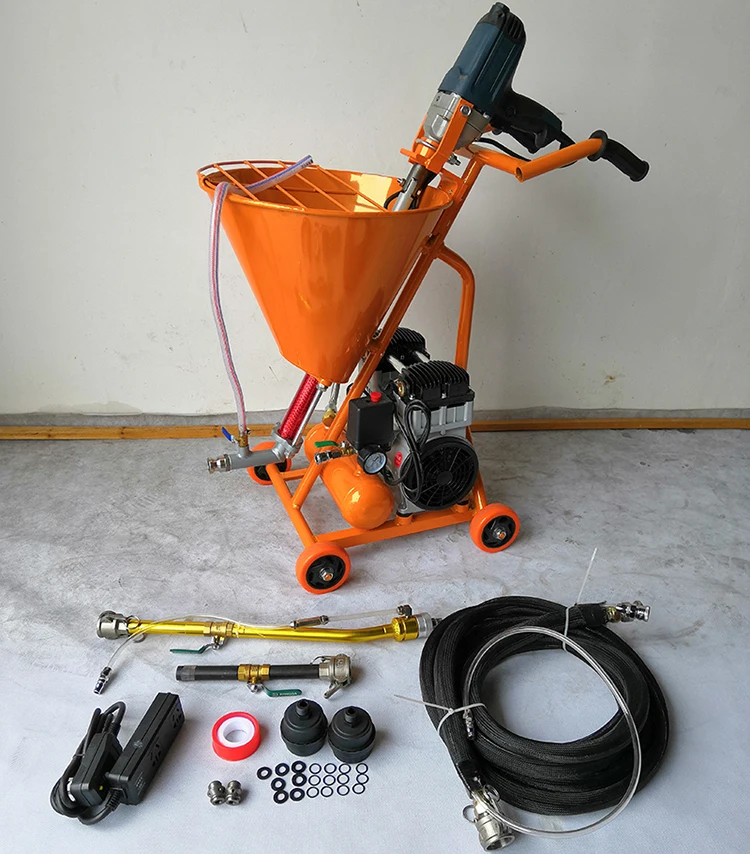 2) С воздушным компрессором в качестве насоса и распылителя для перекачивания и распыления влажных смешанных материалов, таких как штукатурка, декоративная штукатурка, штукатурка из чертополоха и т. д., а также в качестве смесительного насоса.