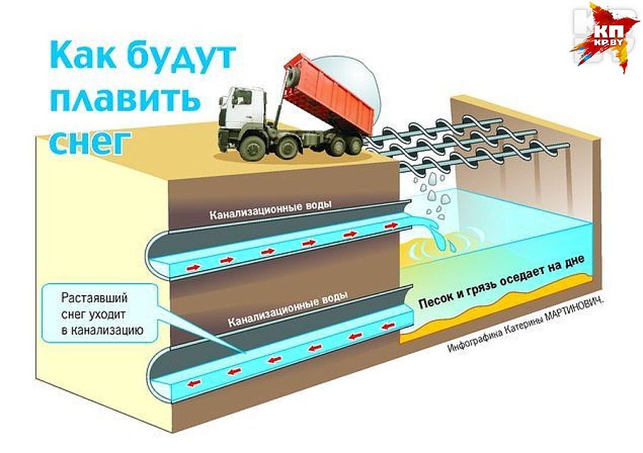 Снег здесь тает под действием естественного тепла и сливается в ливневую канализацию, грунт или ближайшие водоемы.