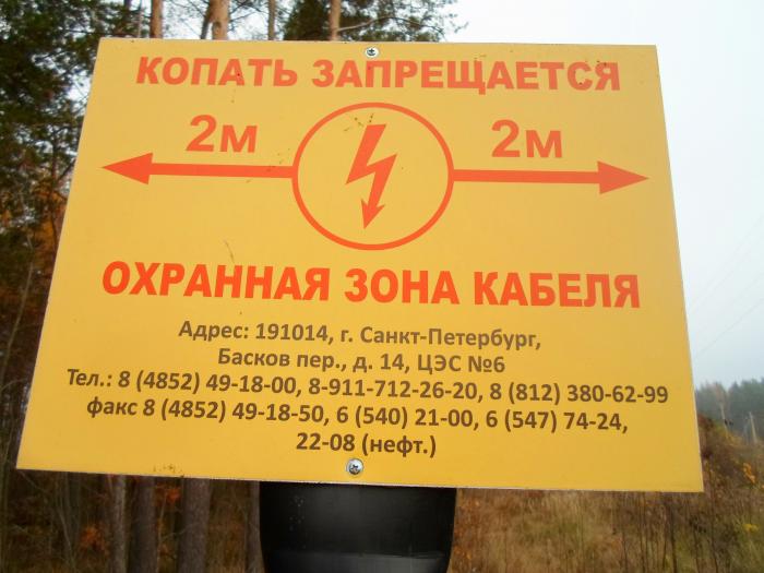 Для информации о прохождении кабеля связи используется специальный знак «Охранная зона». Он может дополняться надписью «Копать запрещается». Знак «Охранная зона кабеля» должен быть установлен на определенном расстоянии от земли — на высоте человеческого роста, 1,7 м. На нем обязательно размещение таких данных, как адрес и телефон эксплуатирующего линию предприятия, размеры охранной зоны.