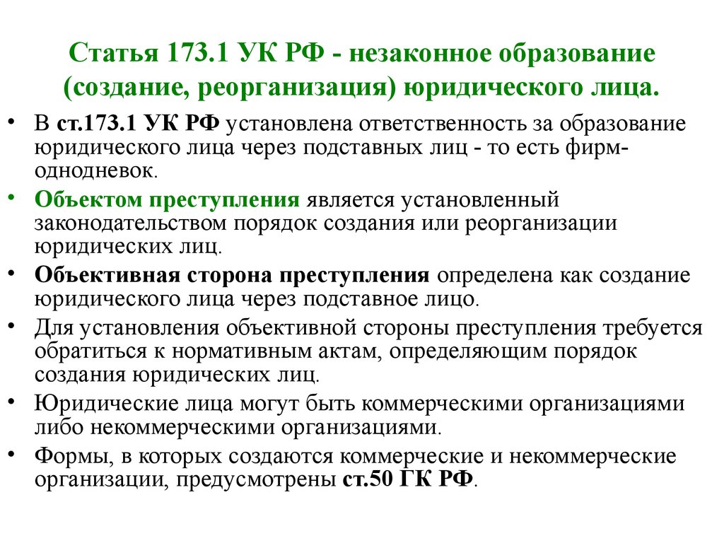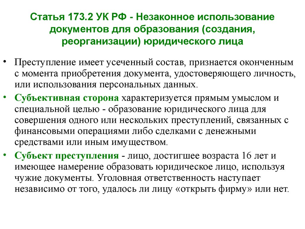4 ст. 10 Федерального закона от 26.10.2002 N 127-ФЗ “О несостоятельности (банкротстве)”). При этом согласно ст. 2 указанного Закона контролирующим лицом признается субъект, имеющий либо имевший в течение менее двух лет до принятия судом заявления о признании должника банкротом право давать обязательные для исполнения указания или возможность иным образом определять действия должника, в том числе путем принуждения руководителя либо оказания определяющего влияния на него иным образом. Уголовным законодательством в настоящее время установлена ответственность за действия в корпоративной сфере с использованием подставных лиц. Согласно ст. 173.1 УК РФ ответственность предусмотрена за образование юридического лица через подставных лиц, а также представление в орган, осуществляющий государственную регистрацию юридических лиц, данных, повлекшее внесение в ЕГРЮЛ сведений о подставных лицах. А в соответствии со ст. 173.2 УК РФ наказываются действия по незаконному использованию документов для образования юридического лица.