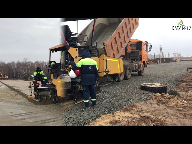 Бункер объемом 7,2 м3, вмещающий до 15 т смеси, позволяет не прерывать процесс укладки даже во время смены грузовиков, загружающих бетонную смесь в бункер. Скорость укладки впечатляет: лента дорожного полотна с бетонным покрытием растет прямо на глазах. Причем практически сразу после укладки слоя бетона средней толщиной 170 мм по дороге начинают ходить люди, что уже характеризует прочность и состояние положенного покрытия.