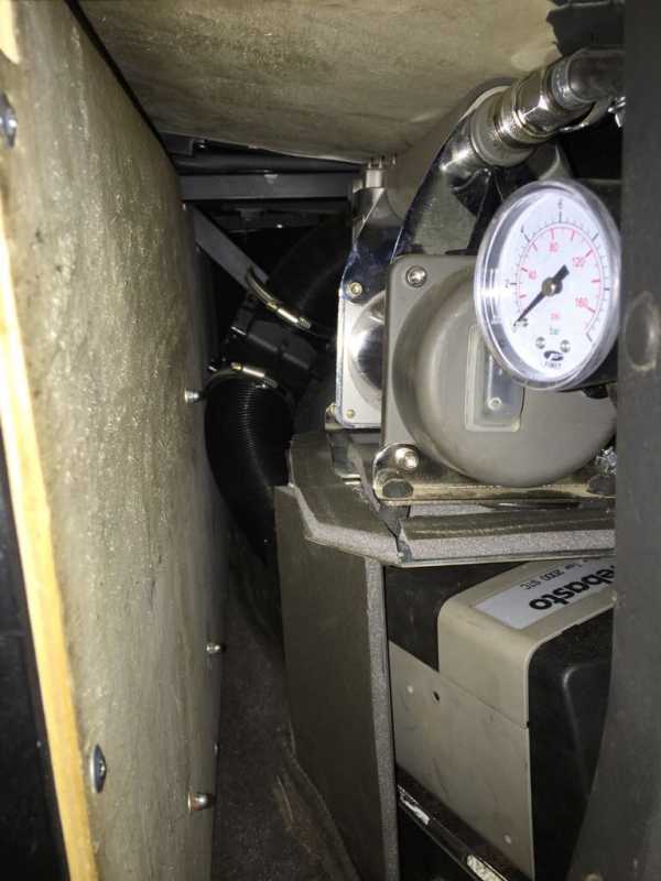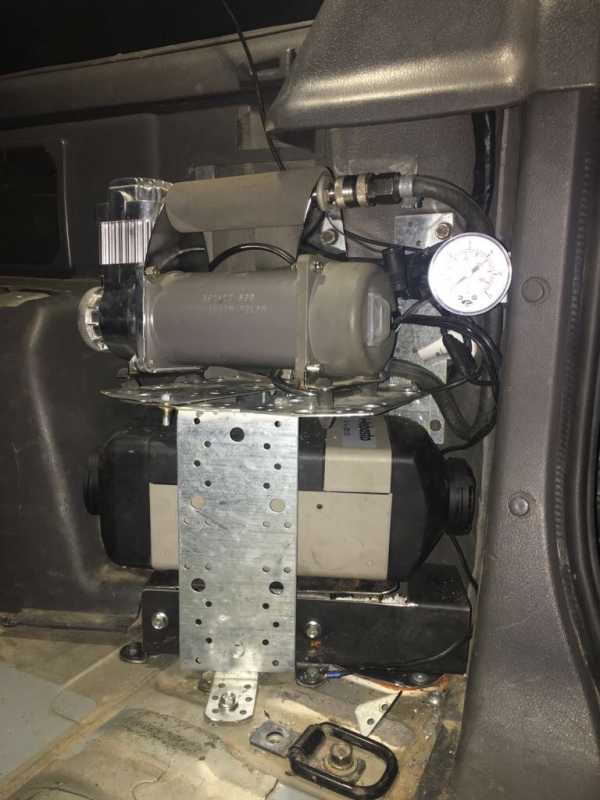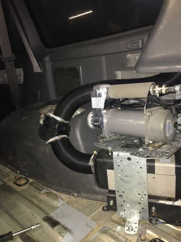 Поэтому было решено ставить фен прямо в крыло заднее справа. Там уже стоял компрессор для пневмосистемы. Пришлось полностью переделывать весь крепеж. Зато подвести топливо и отвести газы получилось через родное отверстие от заднего кондера.