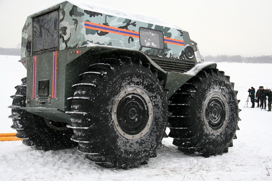 Благодаря широким шинам со сверхнизким давлением при необходимости может использоваться на тонком льду. В комплектацию входит лебедка, с помощью которой снегоболотоход вытаскивает автомобили из полыньи, болот или горной местности.