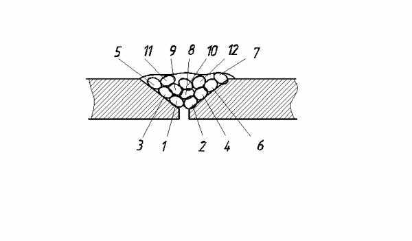 Рис. 61. Заварка чугунной трещины методом отжигающих валиков (цифрами условно показана последовательность наложения валиков)