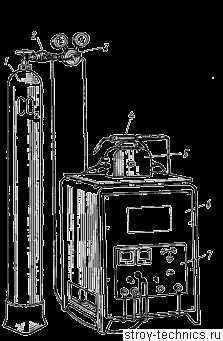 1 — баллон с углекислым газом, 2 — подогреватель, 3 — редуктор-расходомер, 4 — держатель со шлангом, 5 — подающий механизм, 6 — сварочный выпрямитель, 7 — пульт управления