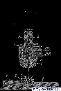 1—индуктивность, 2—генератор, 3—трубопровод, 4 — подающие ролики, 5 — барабан для электродной проволоки, 6 — вибратор, 7 — пружины, 8 — шестеренный насос, 9 — бак-отстойник, 10 — деталь с наплавленным слоем, 11 — зона наплавки, 12 — мундштук