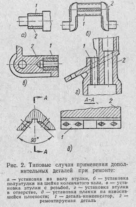 Типовые случаи применения деталей-компенсаторов, используемых для устранения износа сопряжений, показаны на рис.2. При износе наружной цилиндрической поверхности вала на него напрессовывают или сажают на клей втулку (рис. 2, а). На износившуюся шейку коленчатого вала устанавливают полувтулку (рис. 2, б). Если в отверстии «разработалась» резьба, то в него ввертывают дополнительную втулку (ввертыш) с вновь нарезанной резьбой (рис. 2,в). При износе внутренней цилиндрической или конусной поверхности в деталь также вставляют втулку (рис. 2,г). Износ плоскостей чаще всего компенсируют планкой (рис. 2, д), которую привинчивают к ремонтируемой детали. Как видно из примеров, сменные детали в большинстве случаев скрепляют с одной из деталей сопряжения при помощи прессовой посадки, винтов, сваркой или универсальным клеем.