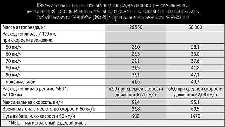 Первый цикл испытаний – определение показателей топливной экономичности и скоростных свойств автопоезда. Как правило, расход топлива на постоянной скорости мы начинаем замерять со скорости максимальной, постепенно снижая ее до приемлемой для данного транспортного средства. Естественно, тяжелый автопоезд должен выйти на постоянную максимальную скорость на последнем километре 5-километровой динамометрической дороги. Как мы ни старались, максимальную скорость автопоезд так и не набирал. Пришлось довольствоваться скоростью, приближенной к максимальной.