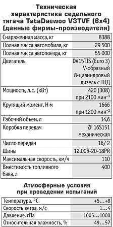После проведения комплекса испытаний автопоезда в составе седельного тягача TataDaewoo V3TVF и полуприцепа-тяжеловоза 99425С мы пришли к следующим выводам. Если не принимать во внимание отклонения в конструкции педального узла и большое возвратное усилие рулевого механизма, все проблемы южнокорейского тягача сводятся к соответствию условий его эксплуатации подбору определенной характеристики трансмиссии. Если сбалансировать эти две составляющие, то эффективность эксплуатации TataDaewoo V3TVF возрастет независимо от того, с каким полуприцепом южнокорейский тягач будет работать в составе автопоезда.