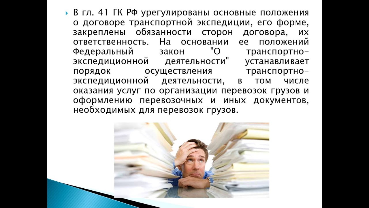 Отношения между экспедитором и клиентом регулируются Гражданским кодексом Российской Федерации, Федеральным законом от 30.