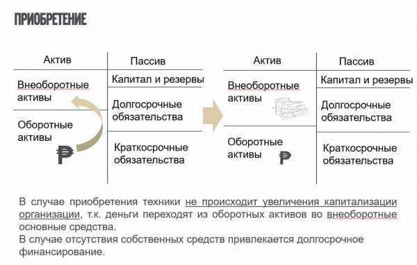В случае приобретения техники не происходит увеличения капитализации организации, так как деньги переходят из оборотных активов во внеоборотные основные средства. Активом является приобретаемое имущество. Владелец самостоятельно заботится обо всем, что связано с владением техникой: оформление документов, уплата налогов и страхование, техническое обслуживание, ремонт и т. д.