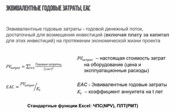 При принятии решения о покупке нового грузовика всегда можно спрогнозировать, какие затраты будут понесены в деньгах сегодняшнего дня, для этого необходимо оценить затраты на приобретение грузовика, все затраты на его содержание в течение срока полезного использования, а также выручку от его продажи в конце срока полезного использования. Полученная сумма отражает приведенную стоимость владения грузовиком за срок полезного использования. Если приведенную стоимость владения заменить равномерными платежами, рассчитанными на основе стоимости заимствования для фирмы в течение срока полезного использования, то полученные платежи как раз и будут эквивалентными годовыми затратами. Этот термин довольно известный, применяется с середины 1960-х годов. Однако он позволяет оценить экономическую эффективность любого оборудования.